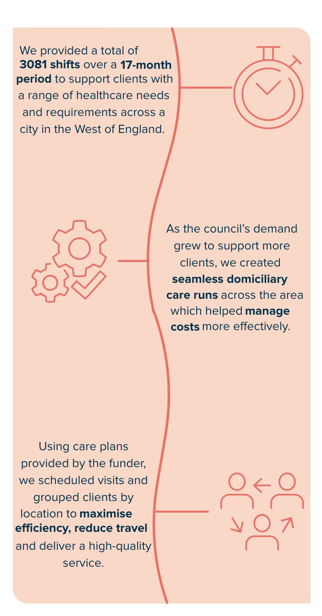 Over the course of our 17-month partnership with the council in the West of England, our dedicated healthcare assistants delivered an impressive 3,081 domiciliary care shifts to adults and elderly individuals across the region.