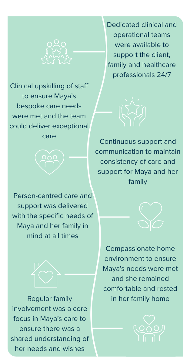 To ensure a person-centred experience for Maya and her family, we implemented bespoke elements to her care package, prioritising comfort, communication and regular family involvement.