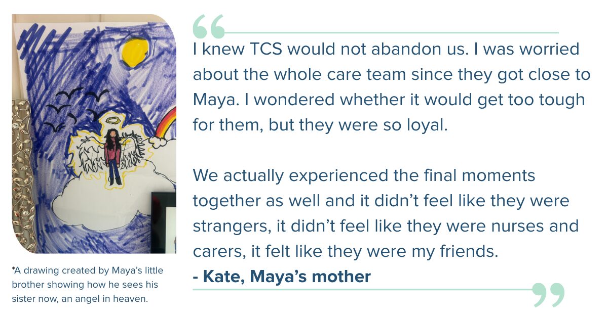 After Maya’s care package came to an end, her mother Kate reflected on the journey the family shared with TCS. She spoke about how the support they received allowed their family to spend precious, meaningful time together in the comfort of their family home.